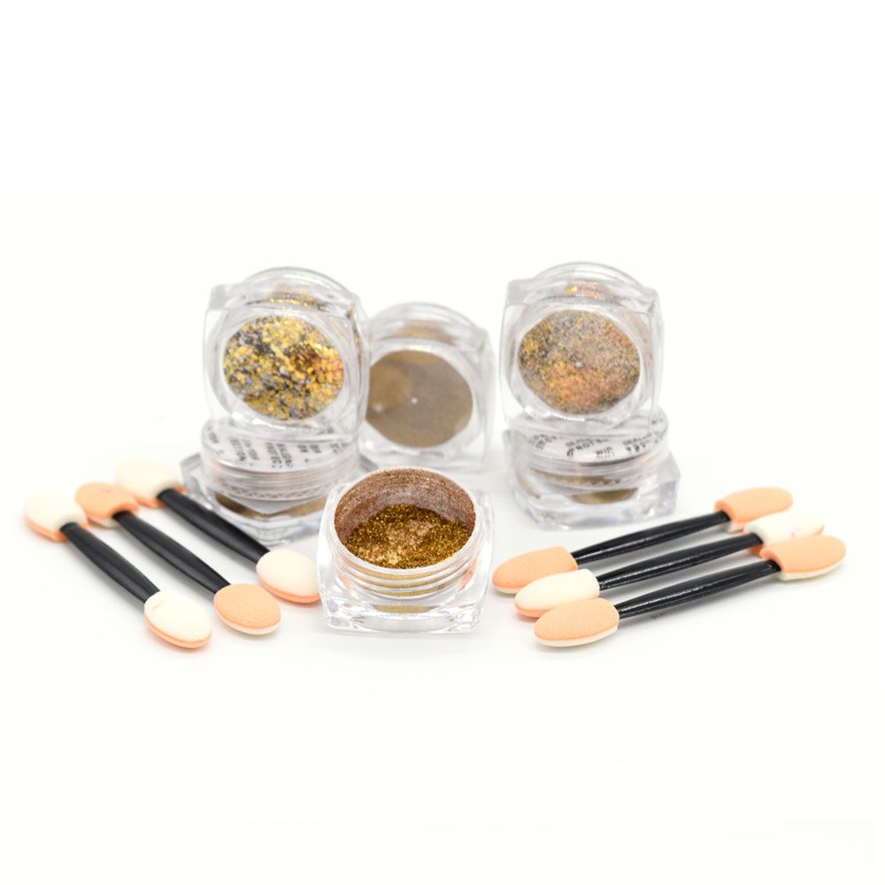 Contiene 6 recipientes con polvos decorativos en tono gold, listos para usar en diferentes diseños de uñas.