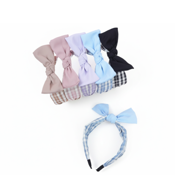 Nuestras diademas están confeccionadas con un tejido suave y de calidad que asegura un ajuste cómodo y seguro sin apretar. Cuentan con un diseño de lazo de tejido liso y una banda inferior con estampado de cuadros, rematada con extremos discretos en negro para una sujeción perfecta