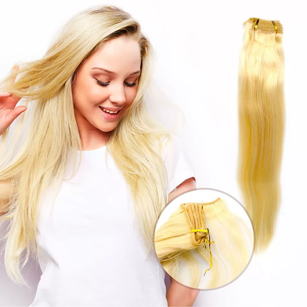 Extensiones enteras de cabello humano, disponibles en color castaño y rubio.