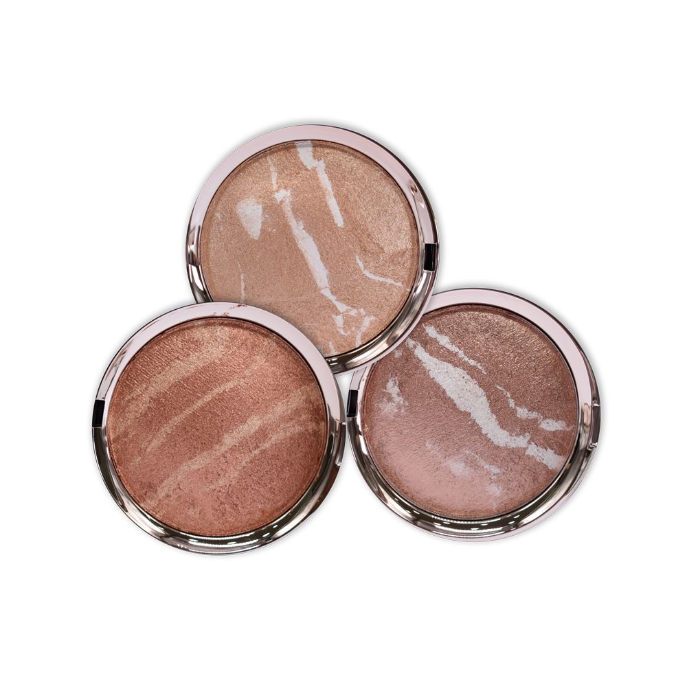 Iluminador en polvo profesional para rostro con acabado glow duradero y pigmentación intensa. Textura sedosa y tonos marmolados para un brillo natural o glamuroso en cualquier ocasión