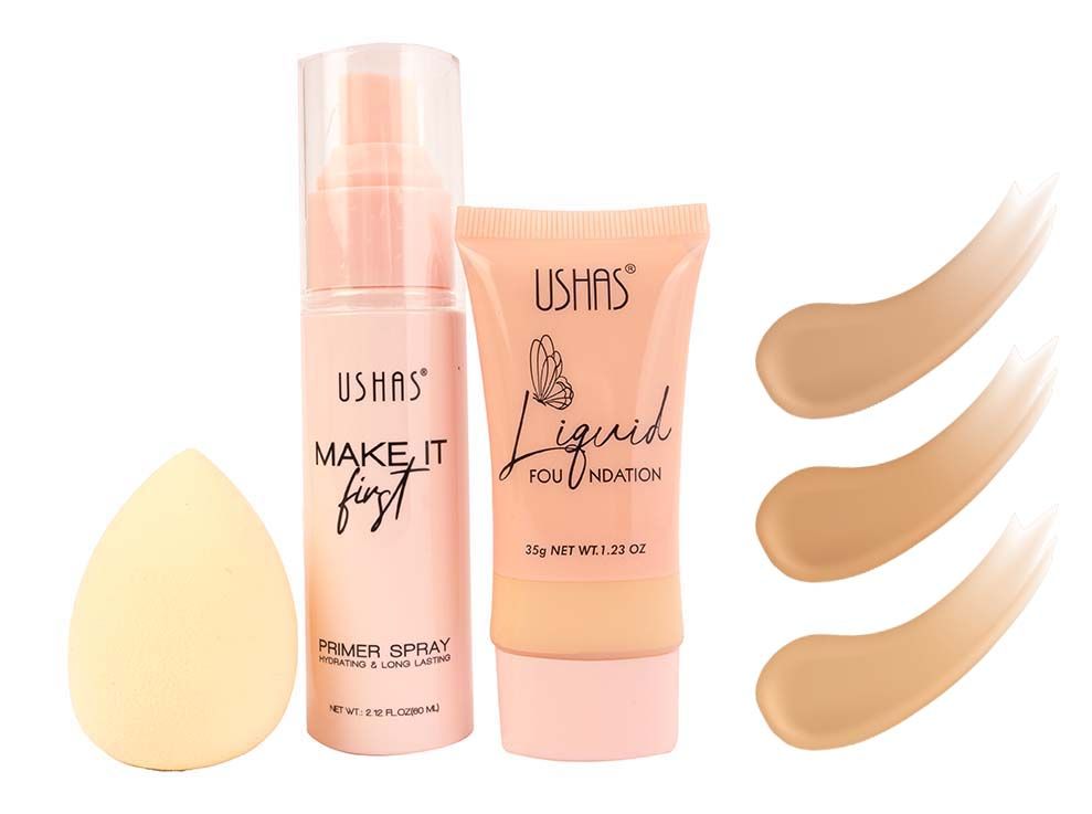 Kit Primer + base líquida (tono claro) + Beauty Blender – Ushas
