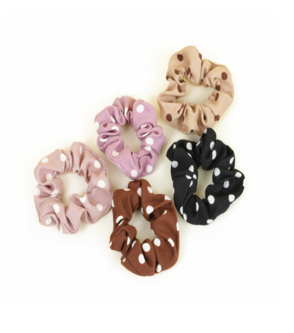 El set contiene 5 scrunchies con estampado de lunares en colores variados, ideales para combinar con cualquier outfit.
