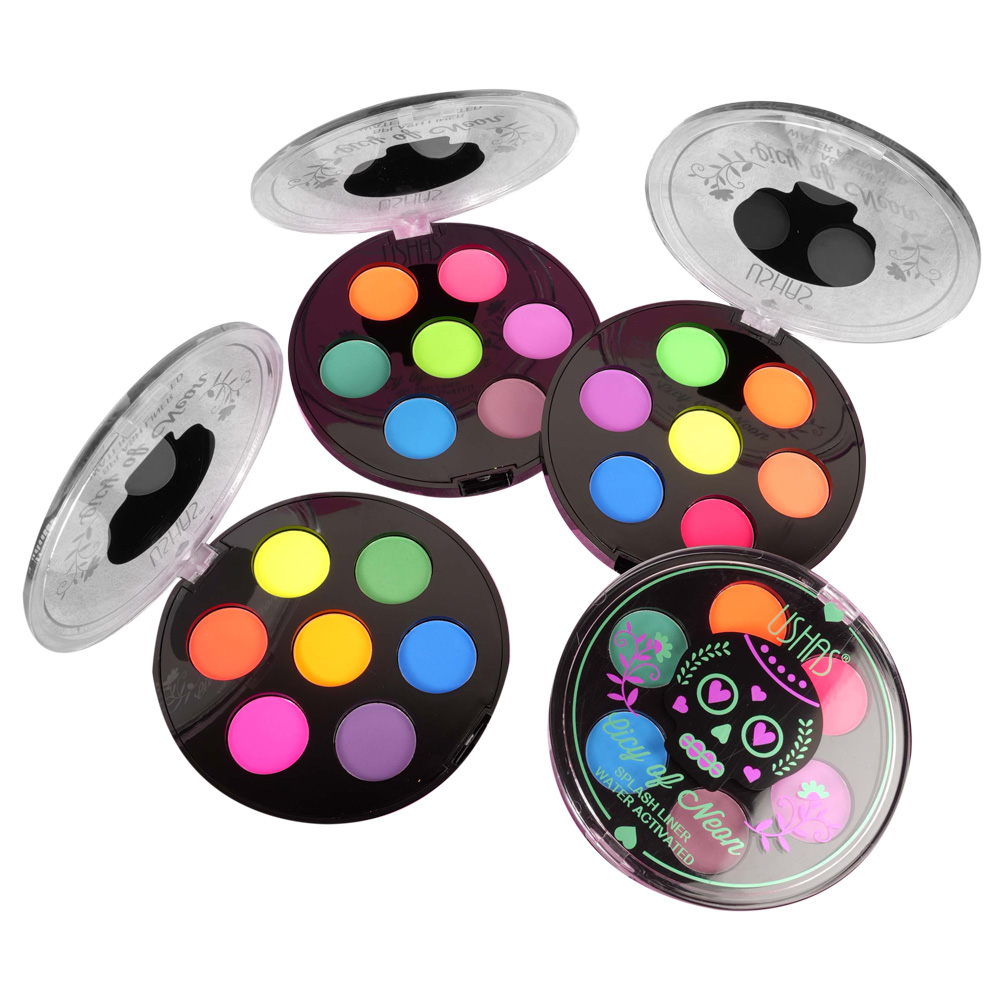 Esta paleta de delineadores neón profesionales incluye 6 tonos intensos y altamente pigmentados que se activan con agua, ideales para crear efectos llamativos en maquillaje artístico, delineados gráficos o body art. Sus colores destacan especialmente bajo luces UV o en ambientes con iluminación natural intensa.