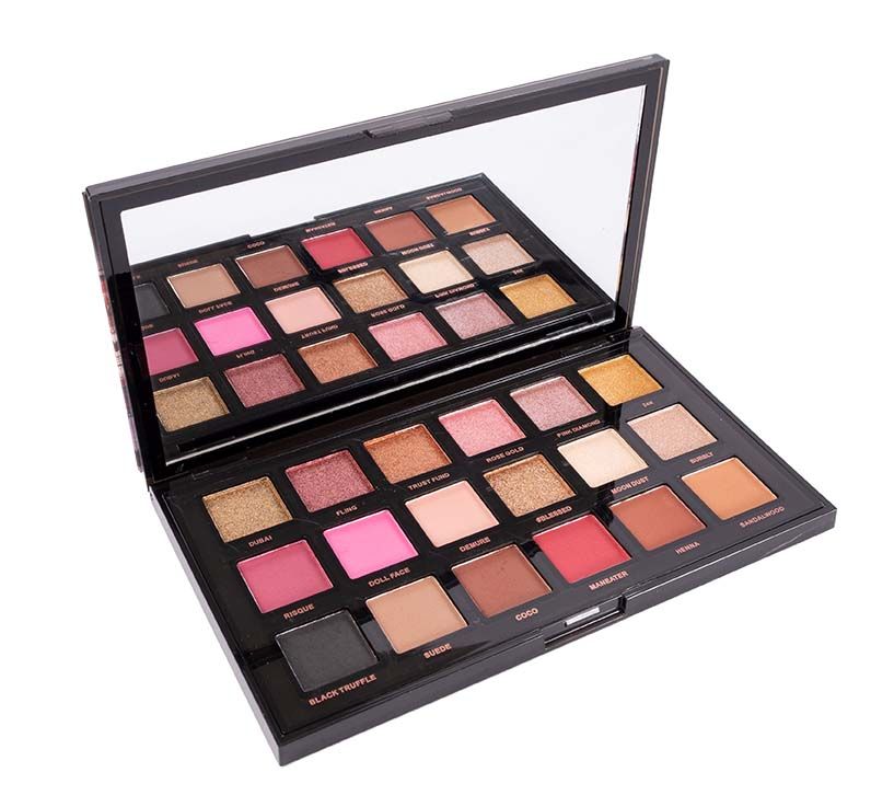 Paleta de sombras rosadas y doradas con 18 tonos profesionales